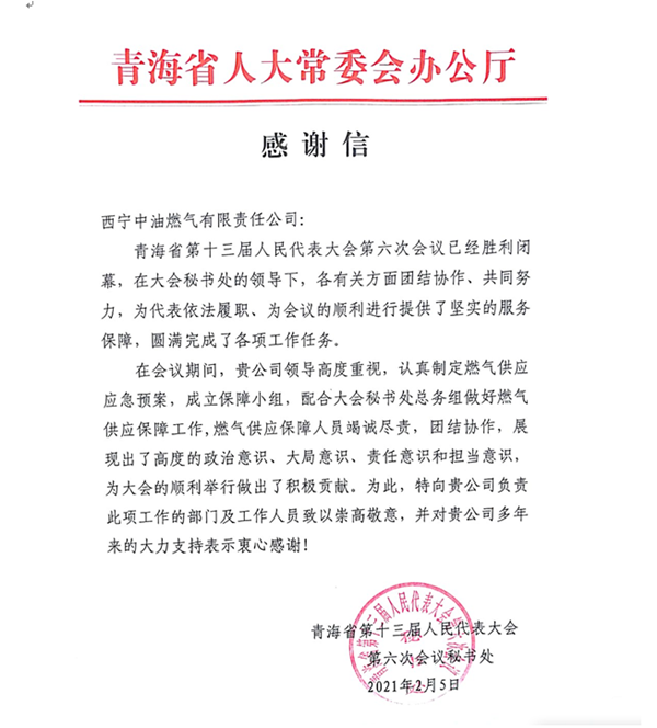 2月5日,省人大常委會辦公廳向西寧中油燃氣發(fā)來感謝信,對西寧中油燃氣在省十三屆六次會議期間,高度重視,周密部署,盡職盡職,以高度的政治意識、大局意識、責任意識和擔當意識做好燃氣供應(yīng)保障工作,為大會的順利舉行做出積極貢獻表示感謝。