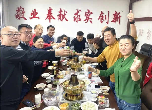 在一樓大廳,大家圍在一起搟皮兒、包餡兒,快樂地忙碌著。余紅偉總經(jīng)理一邊包餃子,一邊與身邊的員工們聊工作、聊家常,大家有說有笑,其樂融融。