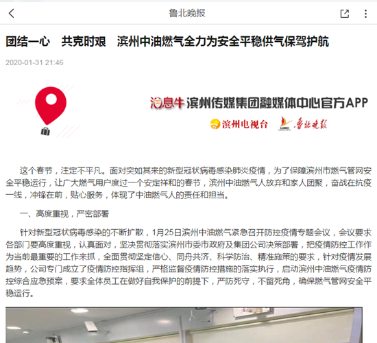 《魯北晚報》報道:團結(jié)一心,共克時艱,濱州中油燃氣全力為安全平穩(wěn)供氣保駕護航