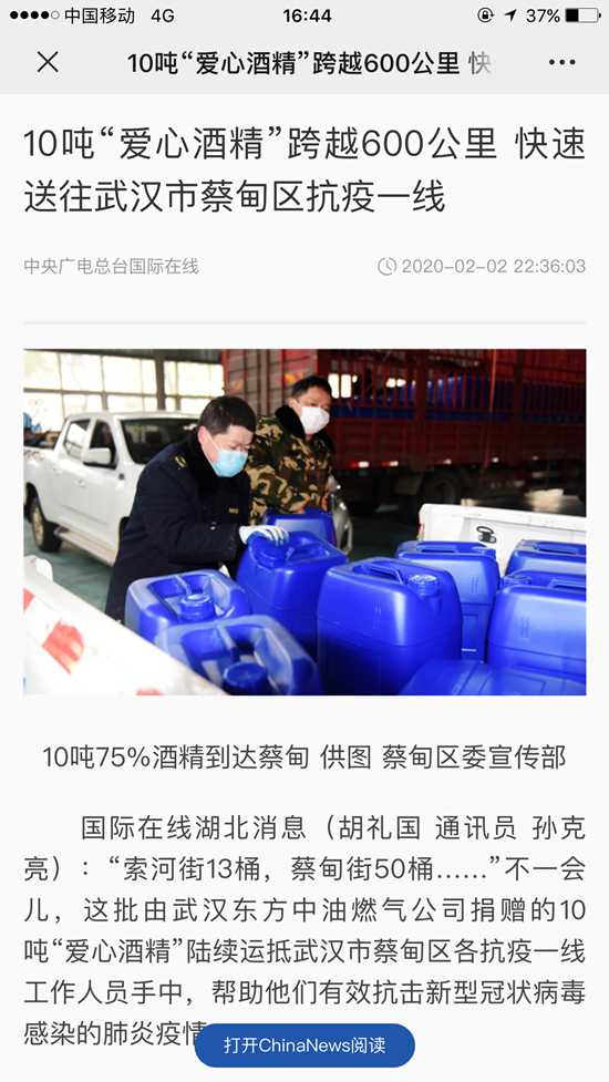 《中央廣電總臺(tái)》:10噸愛心酒精跨越600公里 快速送往武漢抗疫前線