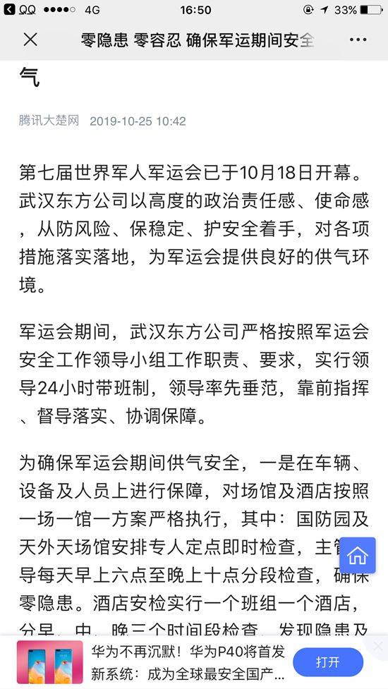 《騰訊大楚網(wǎng)》:零隱患 零容忍 確保軍運會期間安全用氣