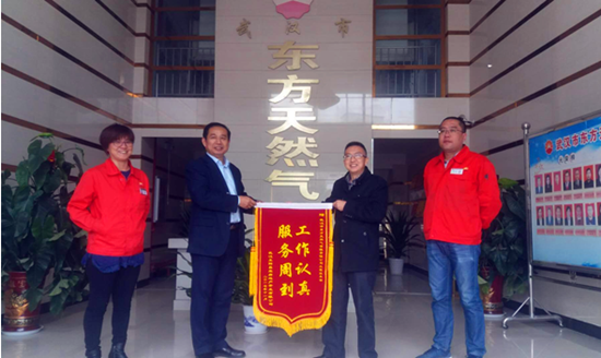 11月15日,武漢正陽昌榮房地產(chǎn)開發(fā)有限責(zé)任公司負(fù)責(zé)人來到武漢市東方天然氣有限責(zé)任公司,送來一面繡有“工作認(rèn)真、服務(wù)周到”的錦旗,對(duì)武漢東方公司給予的大力支持表示感謝!
