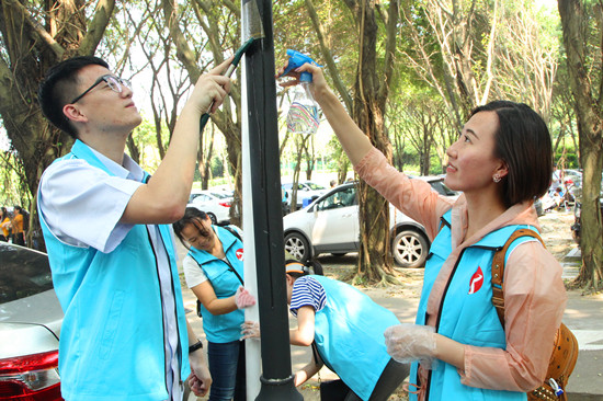 14時,公園內游人如織,行動正式開始。大家?guī)闲∷?、抹布、刮刀等工具,分小組包干到人,以飽滿的熱情投入到清除工作中。經過兩個多小時的“奮戰(zhàn)”,共清理各類垃圾五大塑料袋??粗煤顾畵Q來的“戰(zhàn)利品”,大家都露出了幸福的笑容?;顒咏Y束后,大家向珠海全體市民發(fā)起倡議,從節(jié)約電、水、紙張,到廢舊電池回收和綠色出行等七個方面,承諾保護環(huán)境,低碳生活,從自已做起,讓珠海藍天更潔凈,大海更清澈。