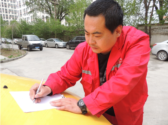 調(diào)壓箱一般都安裝在距離地面1-2米左右的高度,售后維修過程中免不了“上高爬低”的情況,這對于體重90Kg的于鵠鳴來說根本不是阻力,爬梯、半蹲甚至躺臥作業(yè)都不在話下,除了流的汗比常人多之外,故障判斷和維修手藝從沒有落在同事后面。今年上半年在配合西寧公司進(jìn)行調(diào)壓箱防護(hù)欄安裝工作中,他和同事兩人在西寧最熱的兩個月里共安裝了防護(hù)欄488個,每天平均安裝11個,有些小區(qū)的調(diào)壓箱安裝在狹小的角落里,他依然能操作自如,測量、打眼、安裝、固定一氣呵成。大家都說他是全公司最能屈能伸的“大丈夫”。