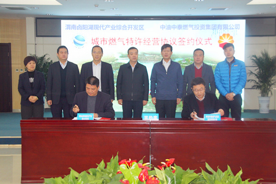 2019年1月3日,集團公司在陜西渭南市鹵陽湖經(jīng)濟開發(fā)區(qū)簽訂《渭南鹵陽湖經(jīng)濟開發(fā)管道燃氣特許經(jīng)營權(quán)協(xié)議》。集團公司總裁劉連勇、鹵陽湖管委會主任趙曉軍出席了簽約儀式。