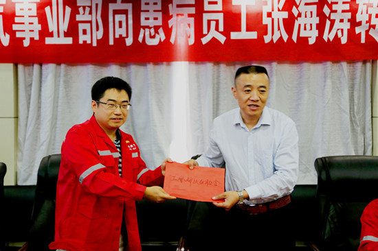 “謝謝青海燃氣事業(yè)部領(lǐng)導和同事們的關(guān)心,我代表張海濤謝謝大家”張海濤哥哥張仲明接過青海燃氣事業(yè)部各公司及員工充滿關(guān)心和溫暖的愛心捐款,向援助張海濤的青海燃氣事業(yè)部的全體員工不停表示感謝。6月22日上午9時,青海燃氣事業(yè)部舉行了“青海燃氣事業(yè)部向患病員工張海濤轉(zhuǎn)交捐款儀式”。中油中泰西部區(qū)域工會聯(lián)合會主席、西寧中油燃氣公司副總經(jīng)理丁濤、青海東部公司總經(jīng)理倪友偉代表青海燃氣事業(yè)部出席了此次捐款轉(zhuǎn)交儀式。
