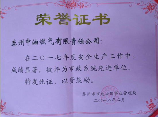近日,泰州中油燃?xì)庥邢挢?zé)任公司被泰州市住建局評為 2017年度“市政系統(tǒng)先進(jìn)單位”,總經(jīng)理丁濤榮獲“市政系統(tǒng)先進(jìn)個(gè)人”。這是泰州公司建設(shè)史上首次獲得這一榮譽(yù)。