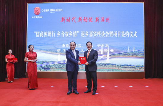 9月30日下午,山東省“儒商大會2018”閉幕後,濱州市舉行主題為“新時代 新動能 新濱州”的“儒商濱州行,鄉(xiāng)音敘鄉(xiāng)情”返鄉(xiāng)嘉賓座談會暨簽約儀式。