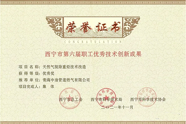 近日,由西寧市總工會聯(lián)合西寧市科學(xué)技術(shù)局、西寧市科學(xué)技術(shù)協(xié)會共同開展的西寧市第六屆職工優(yōu)秀技術(shù)創(chuàng)新成果評選結(jié)果揭曉。我公司研發(fā)的“天然氣脫除重?zé)N技術(shù)改造”成果項(xiàng)目,經(jīng)過層層篩選和評審,獲得優(yōu)秀獎,並頒發(fā)榮譽(yù)證書和經(jīng)費(fèi)補(bǔ)助。
