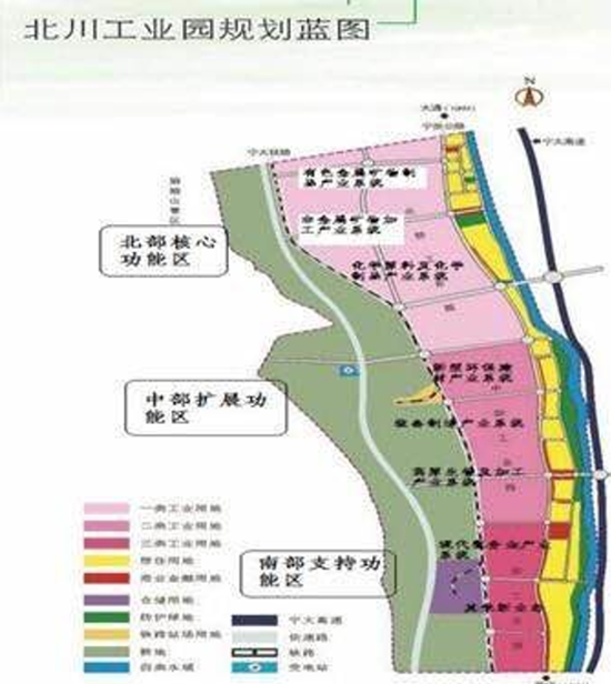 北川工業(yè)園區(qū)於2008年10月經(jīng)西寧市人民政府批準(zhǔn)掛牌成立,園區(qū)總占地面積2145公頃,是國家級鋁鎂合金基地。2013年,新規(guī)劃面積由原來的2145公頃擴(kuò)大至7024公頃,園區(qū)分為北部核心功能組團(tuán)、東北部擴(kuò)展功能組團(tuán)、中部核心功能組團(tuán)、中部擴(kuò)展功能組團(tuán)、南部支援功能組團(tuán)。2014年底園區(qū)內(nèi)入駐企業(yè)192家,計畫在2020年底工業(yè)產(chǎn)值達(dá)500億元。