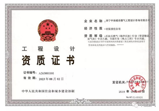 8月21日,經(jīng)青海省住房和城鄉(xiāng)建設(shè)廳批準(以下簡稱省住建廳),西寧中油城市燃氣工程設(shè)計諮詢有限公司取得了工程設(shè)計石油天然氣(油氣庫)專業(yè)乙級、市政行業(yè)(熱力工程)專業(yè)丙級資質(zhì)。
